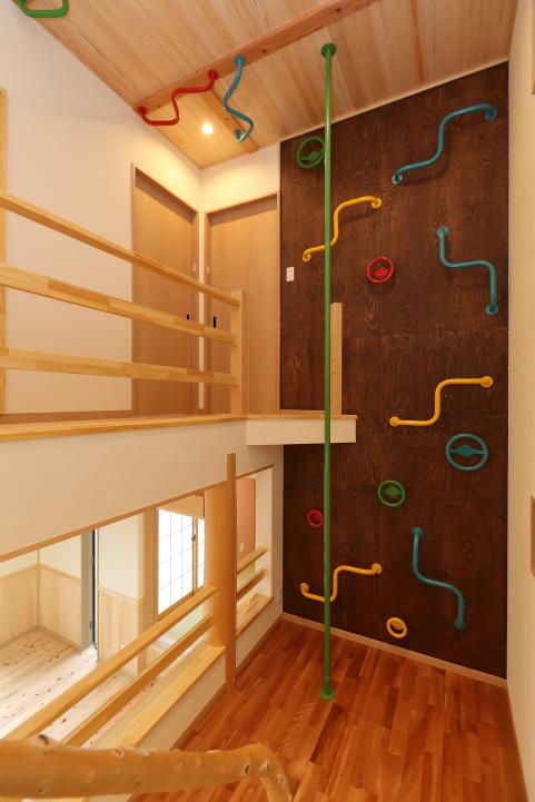 アスレチックが壁一面広がるスキップフロア・・・。使い方無限大の大人ゴコロをくすぐるこだわりいっぱいの木の住まいが完成しました。