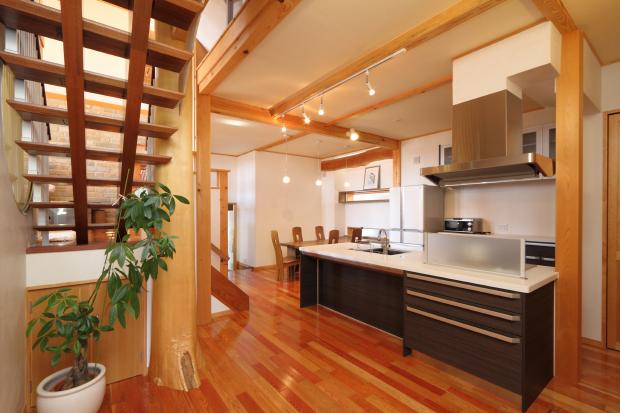 施主様自ら選ばれた柱や梁が個性的なLDK。小上りの和室から繋がる秘密基地のような半地下ホビールーム。